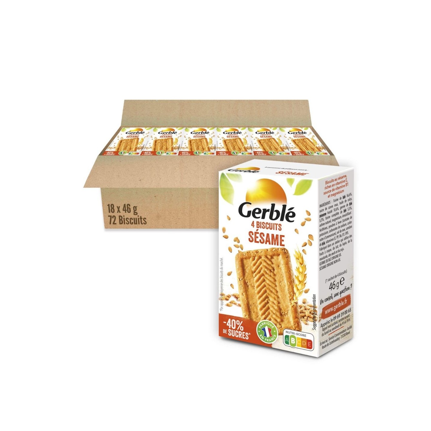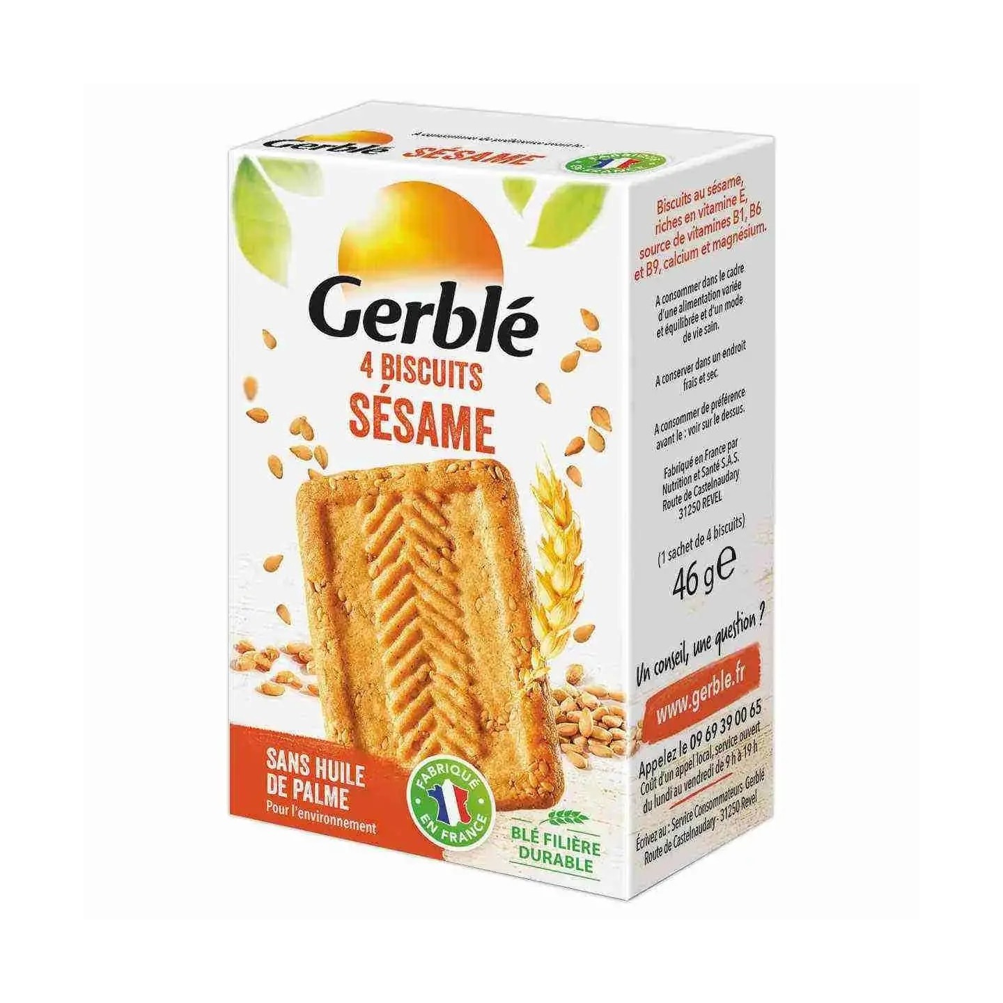 Composition : farine de blé (55%), sucre de canne roux, huile de colza (14,2%), sésame toasté (11,6%), germe de blé (5,2%), levain de seigle dévitalisé en poudre, fibres d’avoine, calcium, sel de mer, arôme naturel de vanille, magnésium, émulsifiant (lécithines de colza), poudres à lever (tartrates de potassium, carbonates de sodium, carbonates d’ammonium), acidifiant (acide malique), protéines de lait, amidon de blé, vitamines B1, B6, B9, PP et E (lactose, protéines de lait).